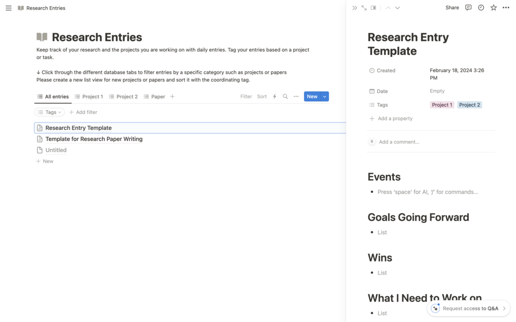 Keep track of all your research project updates with this research dashboard. You can sort your entries by project and stay on track with research paper writing.