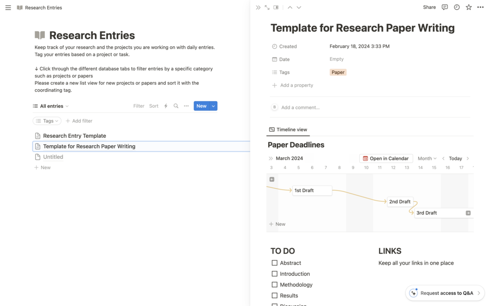 A research dashboard with two templates that helps you track your research and writing progress.